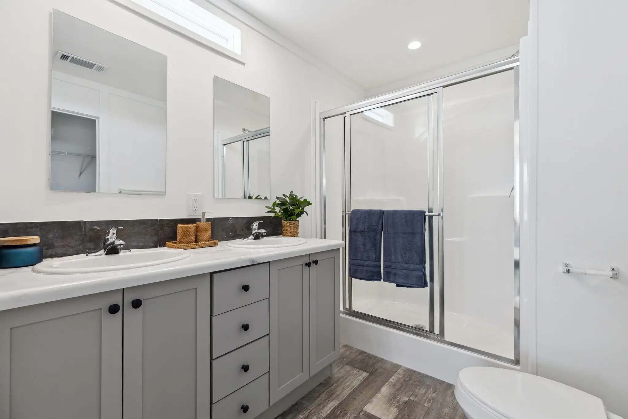 The spacious kitchen features Shaker-style cabinetry, stainless steel appliances, and elegant Calacatta Lincoln countertops. Bathrooms are equally refined, with fiberglass showers, comfort-height commodes, and contemporary vanities. The Chateau offers the ideal mix of style, comfort, and value - perfect for enjoying relaxed, lakefront 55+ living.