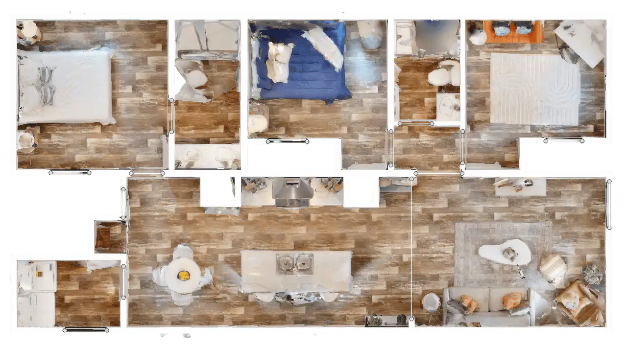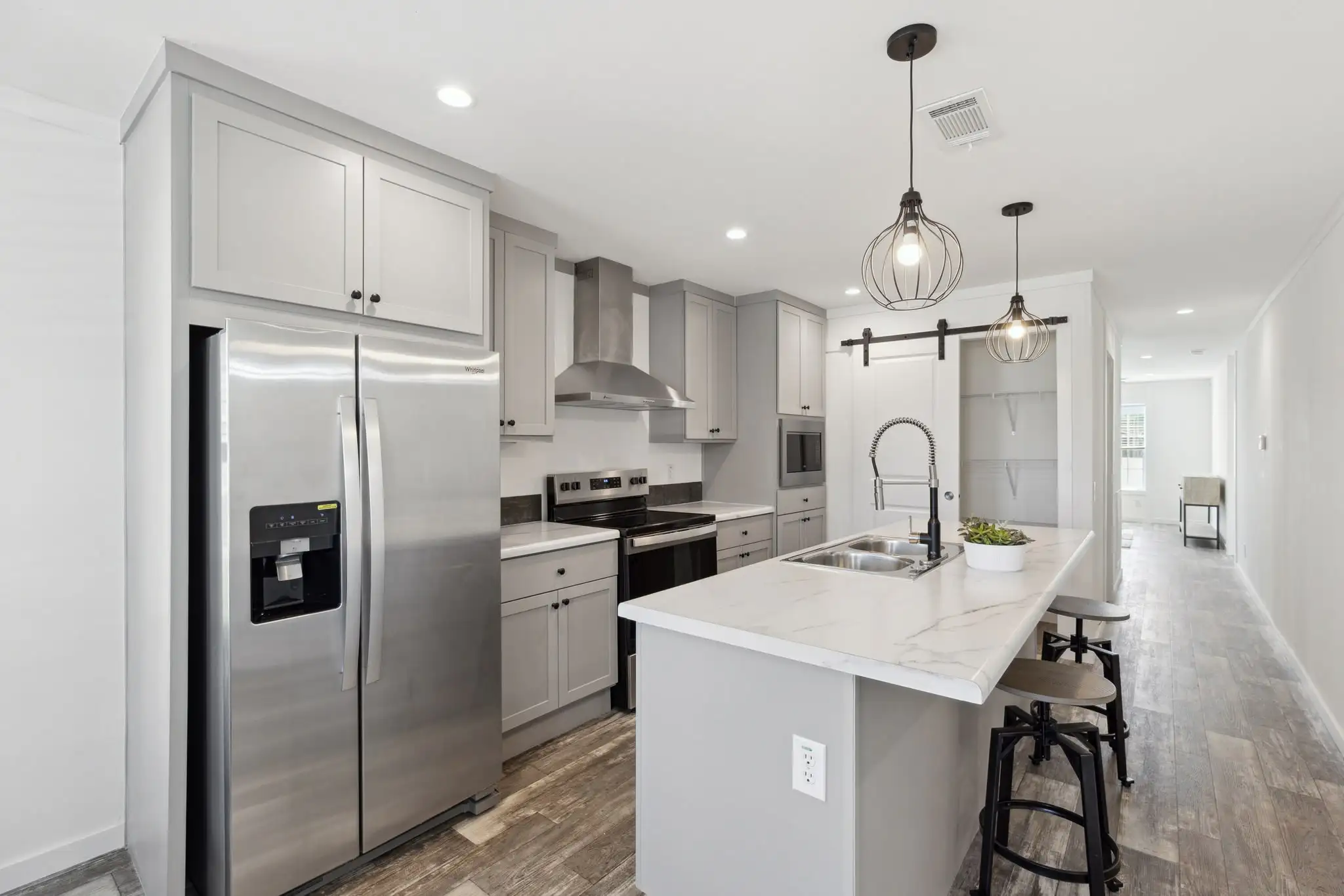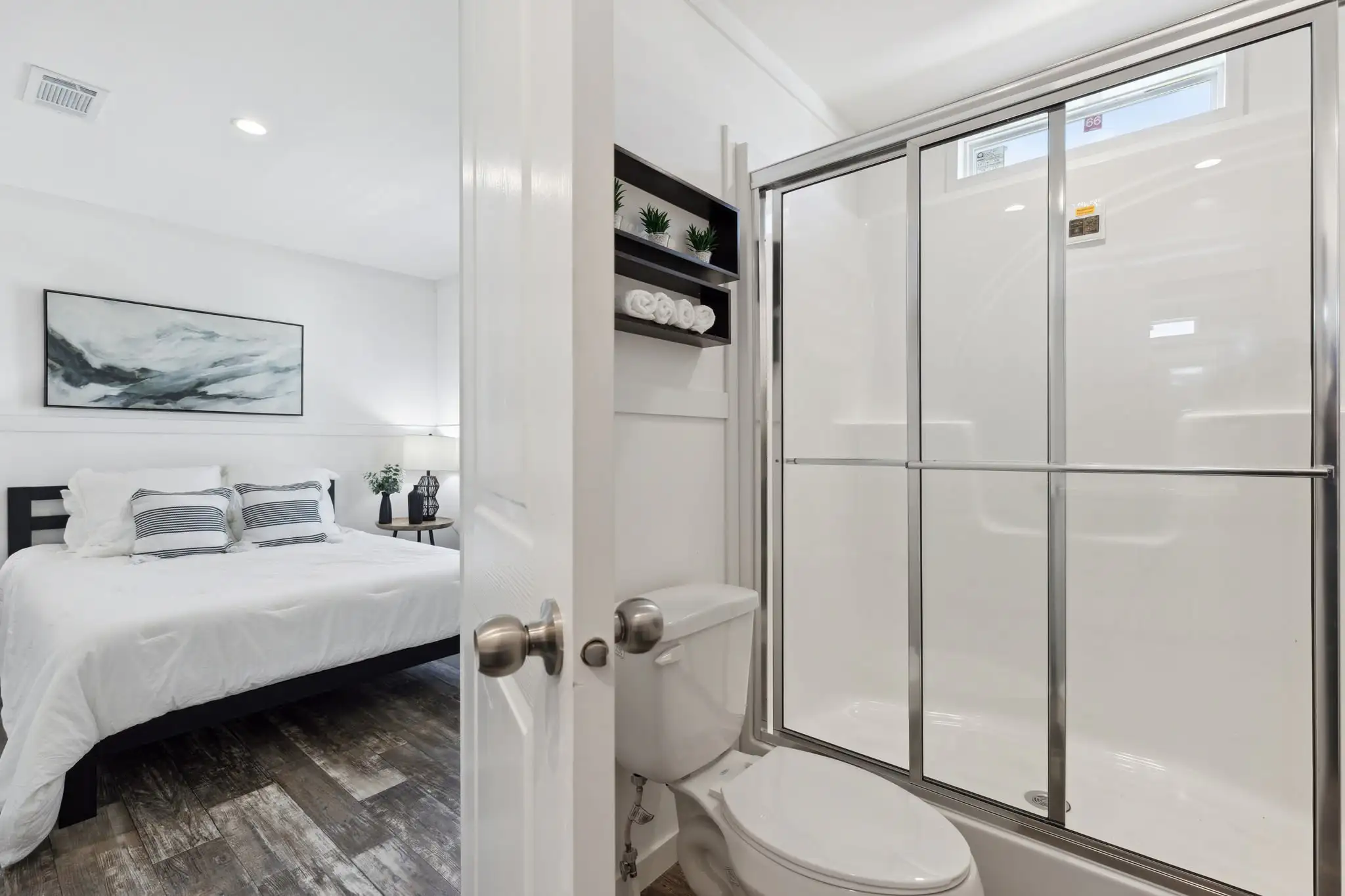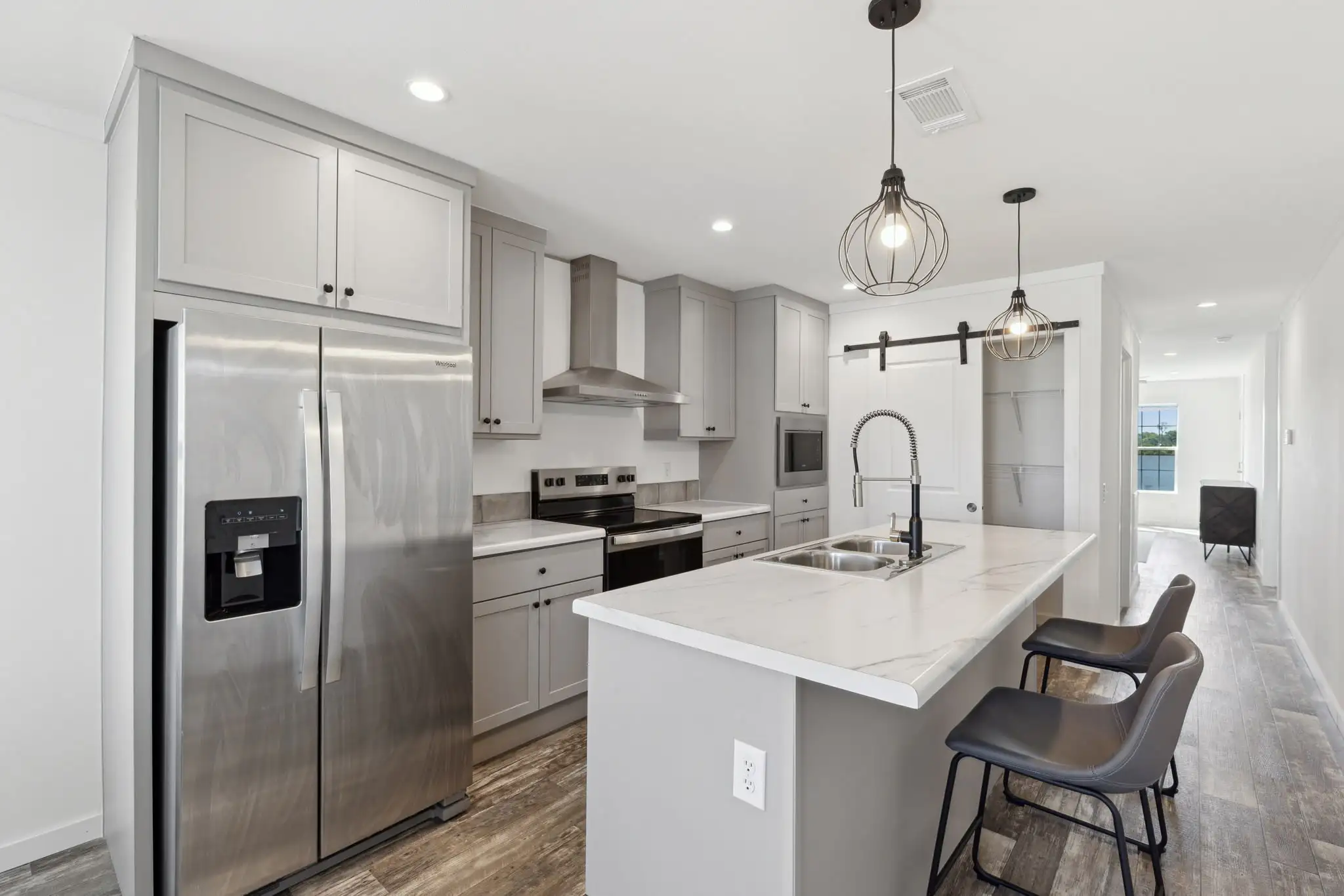 The kitchen impresses with Shaker-style cabinets, sleek stainless appliances, and bold Calacatta Lincoln countertops. In the bathrooms, you’ll find fiberglass showers, raised commodes, and tasteful vanities - bringing comfort and style to everyday living.